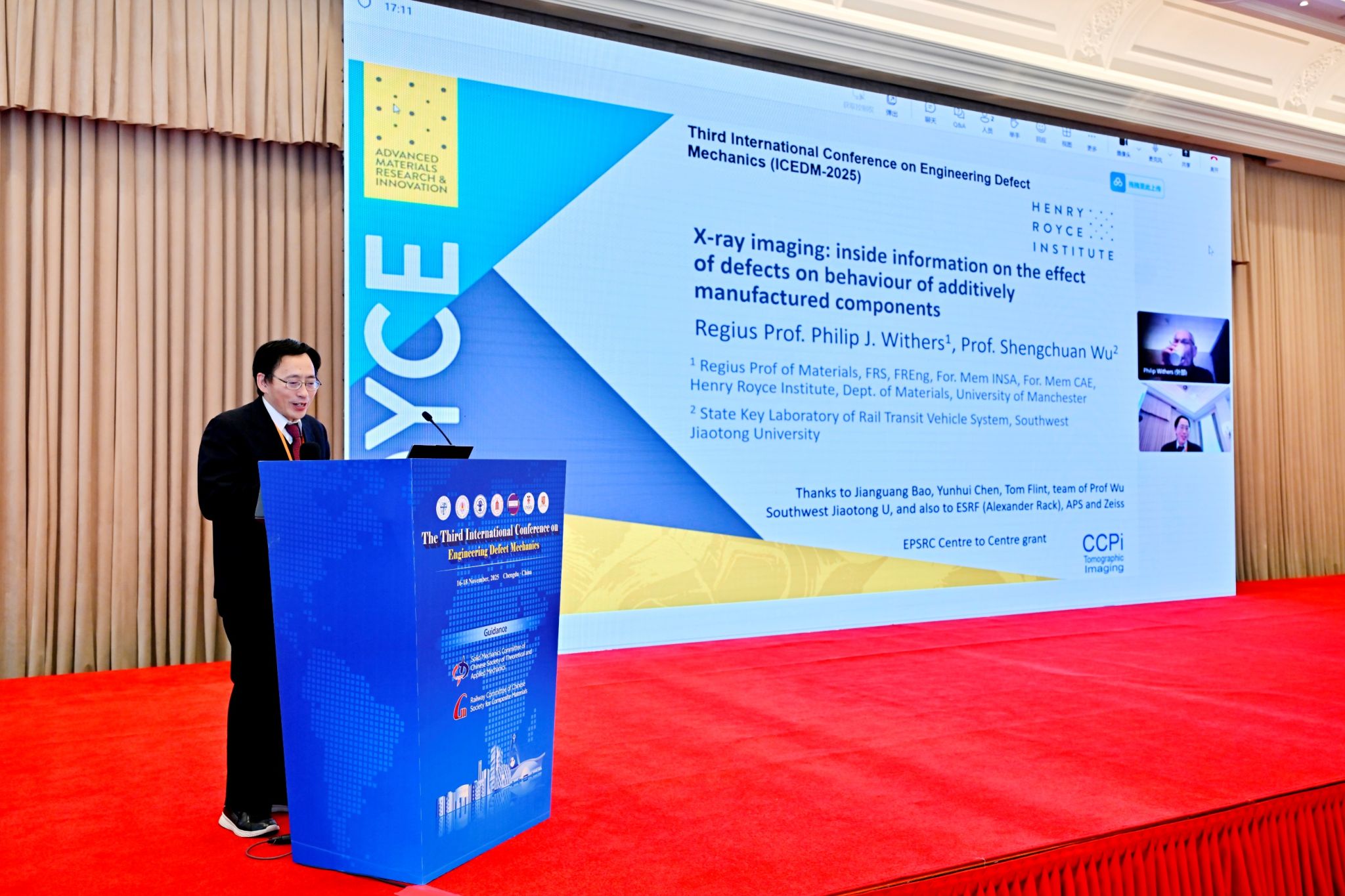 会议期间,国内外领域顶尖专家学者联袂呈现了高水平主旨报告。英国皇家工程院和科学院院士、中国工程院外籍院士Philip J. Withers围绕《X-Ray Imaging: Inside Information on the Effect of Defects on Behaviour in Additively Manufactured Components》作专题汇报,详解了高分辨X射线在先进材料及结构内部缺陷成像与抗疲劳评估中的关键作用及进展;世界科学院院士、印度国家工程与科学院院士、南洋理工大学首席教授Ramamurty UPADRASTA发表了《Strength, Ductility, Fracture Toughness, and Fatigue Resistance of Additively Manufactured Alloys》主旨演讲,剖析了内部缺陷对增材合金强度、延展性、断裂韧性等核心性能的影响机制。英国曼彻斯特大学国家X射线CTav影片直播