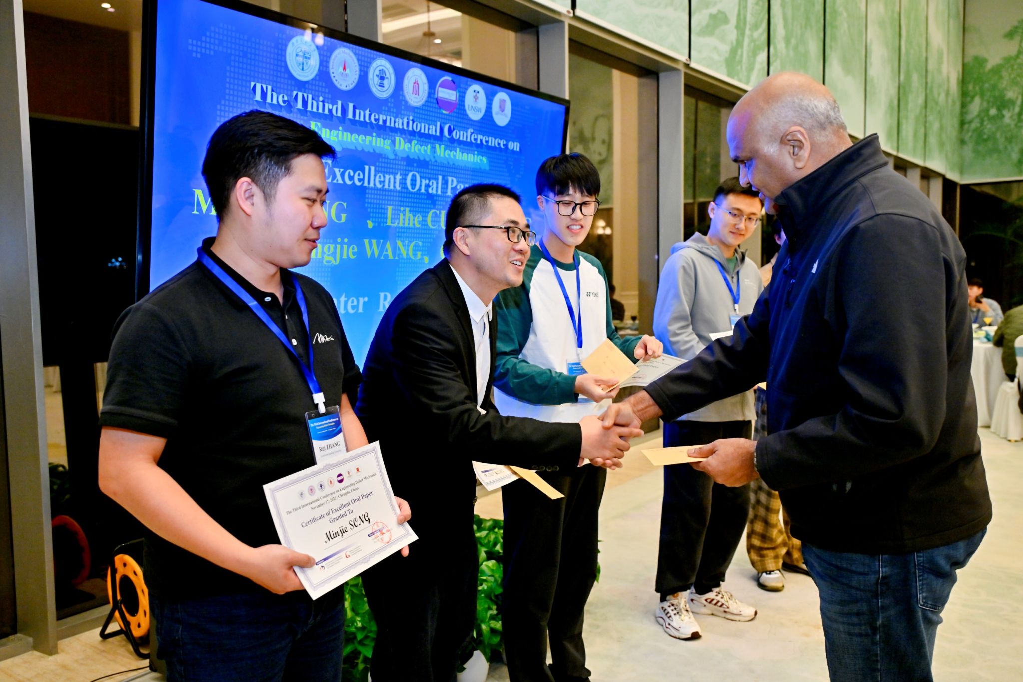 在17日下午分论坛报告上,经分会场主席及投票, 20位优秀学术报告奖(均为研究生)脱颖而出。晚宴期间,分别由Ramamurty UPADRASTA教授、徐平光研究员、洪友士研究员、张哲峰研究员为获奖研究生颁发荣誉证书及奖金。此举将进一步激励青年学者在工程缺陷容限力学领域持续深耕、锐意进取。