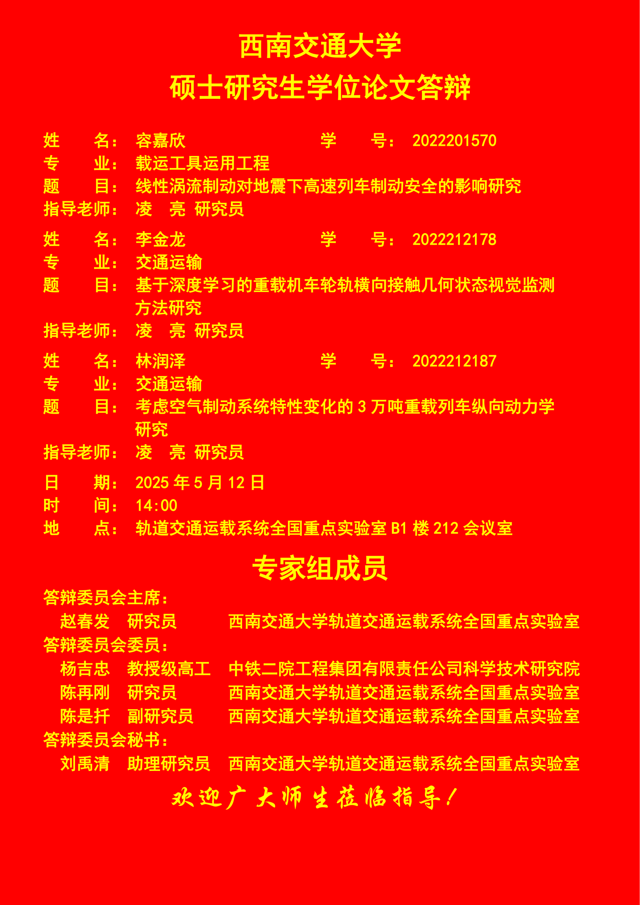 西南交通大学容嘉欣、李金龙、林润泽硕士学位论文答辩